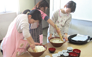 (資)野田味噌商店の講師から木桶による天然醸造みその特長やみその種類などを学習しました。その後、粒みそと豆みそのミックスたれを使い、五平餅作りに取り組みました。きのこのみそ汁も一緒に作り、出来たてを味わいながら交流を行いました。