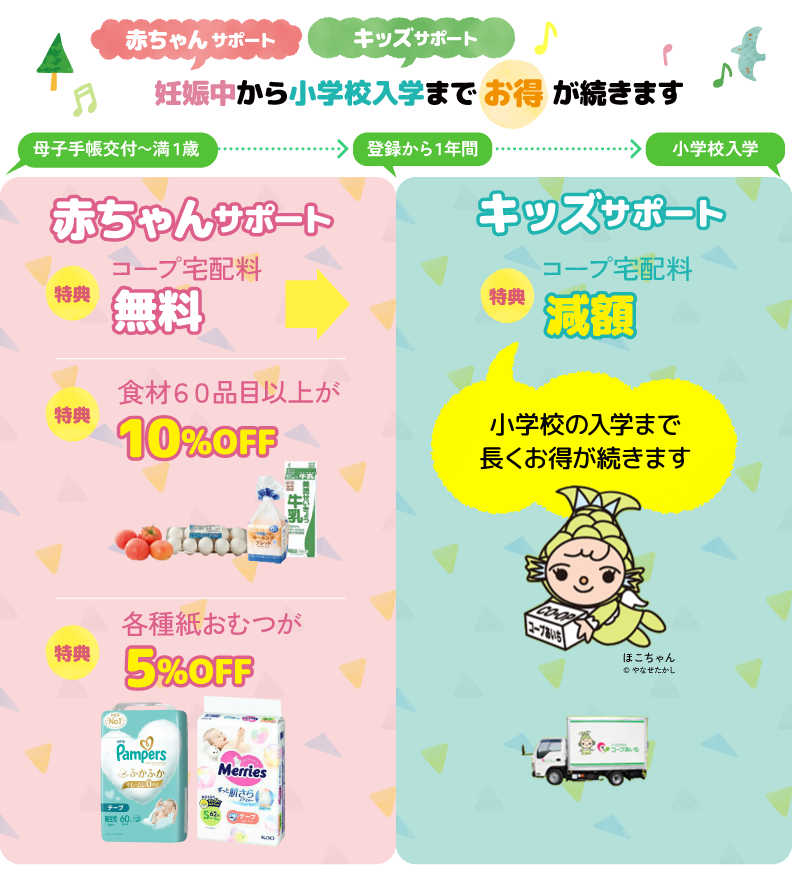 母子手帳交付から小学校入学までのお子さんがいらっしゃる方へコープ宅配の宅配料がお得になる安心・サポート制度です。