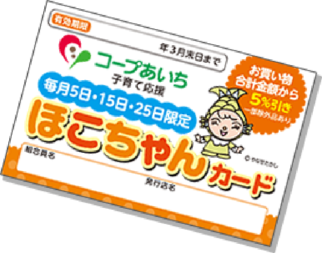 0才~小学校卒業までのお子さんをお持ちの組合員限定の割引サービスです。事前に登録していただくことで、毎月のほこちゃんデー(基本5日、15日、25日)にお買い物代金から5%割引いたします。