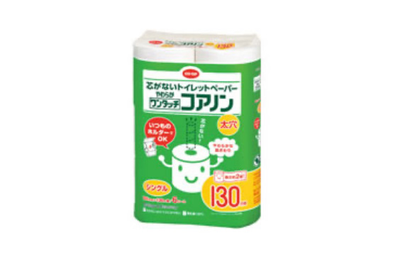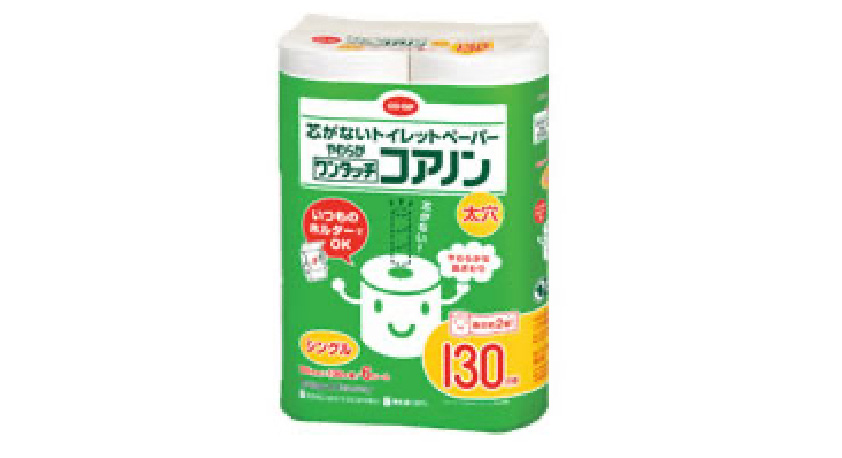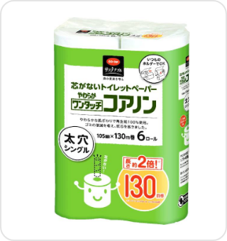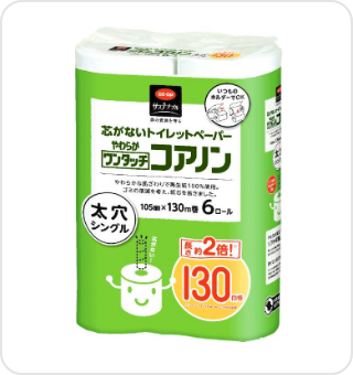 コアノン・太穴一般的なトイレットロールの約2倍の長さで、芯部分まで使えてゴミも出ません。購入回数が少なくすみます。