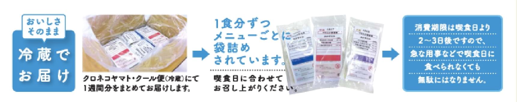 毎週土曜日に翌週5日分をクロネコヤマト・クール便(冷蔵)でご自宅へお届けします。