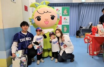 中日ドラゴンズのマスコットキャラクター「パオロン」と共に。