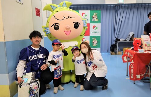 コープのブースでは、オリジナルのうちわやポケットティッシュを配布。ドラゴンズ、タイガースのファンの方と記念撮影も。