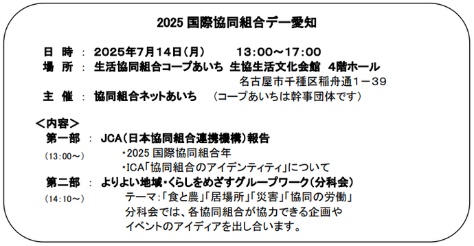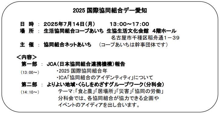 国際協同組合デーを記念して、「2025 国際協同組合デー愛知」を開催します。県内のさまざまな分野の協同組合から役職員が集結。愛知におけるよりよい地域社会づくりに向けて、協同組合の役割について話し合い、連携を深めます。
