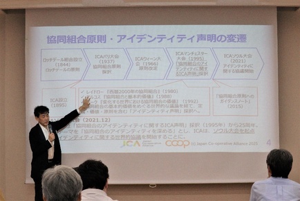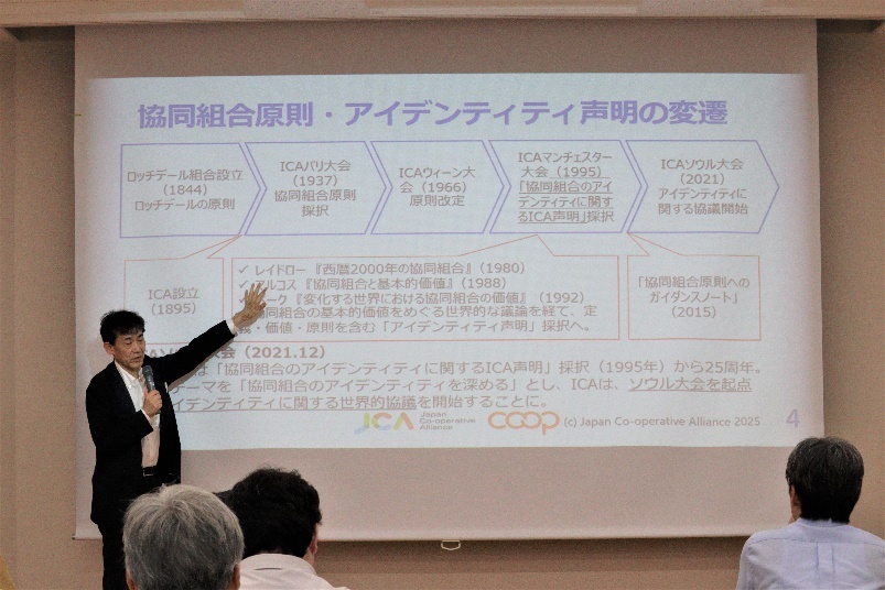 協同組合のアイデンティティや歴史、国際協同組合年(IYC2025)の意義、他県の取り組みや、大学講座の紹介をされました。