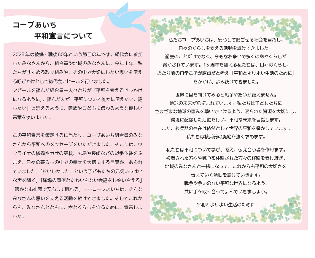 今年2月1日~16日に組合員のみなさんに、平和を実感するときや自分にできることなど、平和のメッセージの呼びかけをし、6月10日の通常総代会において特別アピールを提案し「コープあいち平和宣言」が採択されました。