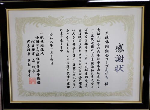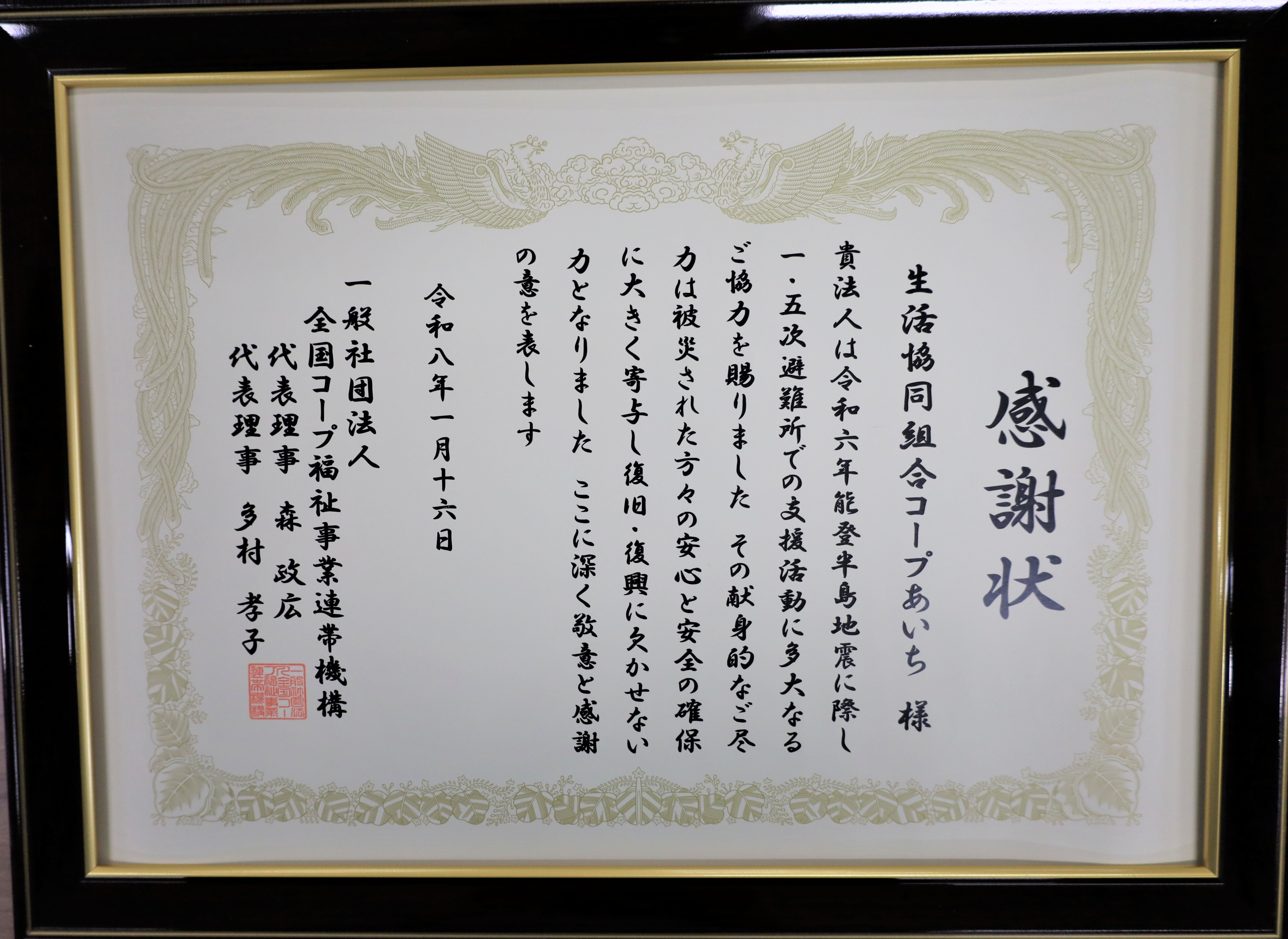 生活協同組合コープあいちは、令和6年能登半島地震における災害支援活動に対し、全国コープ福祉事業連帯機構より感謝状をいただきました。