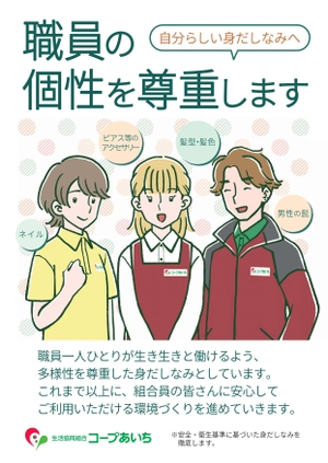 コープあいちは、職員一人ひとりが生き生きと働けるよう、多様性を尊重した身だしなみとしています。