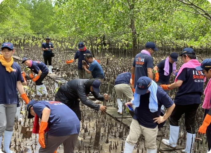 使わなくなったえびの養殖池を自然に戻すために、インドネシア・タラカン島でマングローブの植樹に取り組んでいます。東海コープでは2014年までに11,400本の植樹を行いました。