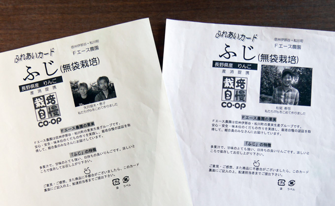 Fエース農園のりんごや梨に入っている生産者カード。感想を記入する欄も。 -
