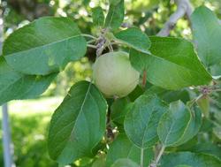 なりはじめのりんごの状態を確認し、よい実に育つものを選んでそれ以外のものは手で摘み取る。 -