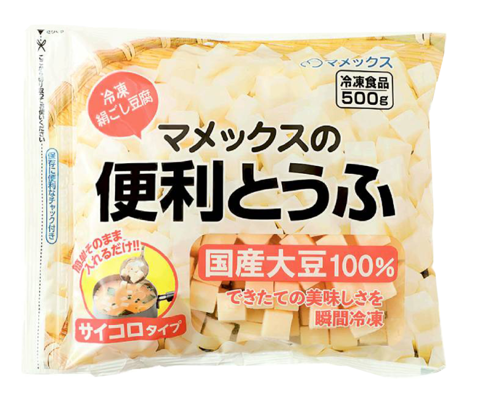 かつて豆腐は、一丁単位で買うものでした。残った豆腐は冷蔵庫で保存しても日持ちしません。技術の進歩で賞味期限が延びた豆腐もありますが、使い切るのが原則です。マメックスは「もっと使いやすく、日持ちさせたい」と豆腐の冷凍に取り組むことにしました。通常豆腐は冷凍できません。凍る際に内部で氷の結品が大きくなり、豆腐の組織を壊して「す」が入ってしまうからです。開発は失敗の連続でした。改善を重ね2年の歳月をかけて独自技術を開発。型崩れしにくい滑らかな冷凍豆腐を作り出しました。同じころ、生協では組合員の「日持ちする豆腐がほしい」という声で、メーカーを探していたところ、すでに学校給食で使われていたマメックスの冷凍豆腐にたどり着き、取り扱うことになりました。