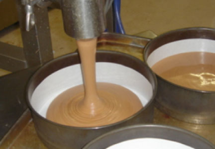 材料を大きな容器に入れ、撹拌(かくはん)。完成した生地を直径21センチの丸型に流していく -