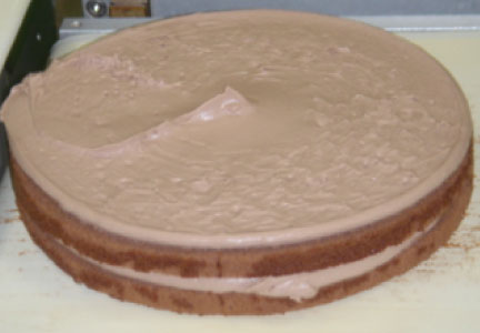 焼き上がったスポンジは、一晩おいて生地を落ち着かせる。3等分にカットし、チョコクリームを塗っていく -