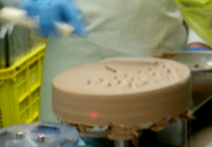 専用の器具でつついて突起を作る。機械ではできないため、1つ1つ手作業で行う