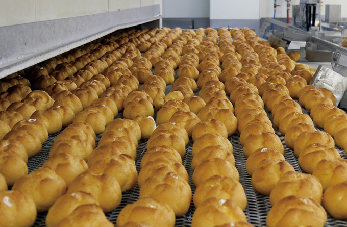 シュー皮にアイスを充填したのち、急速冷凍されたシューアイス。計量・異物混入の検査を受け、パッケージへと詰められる。