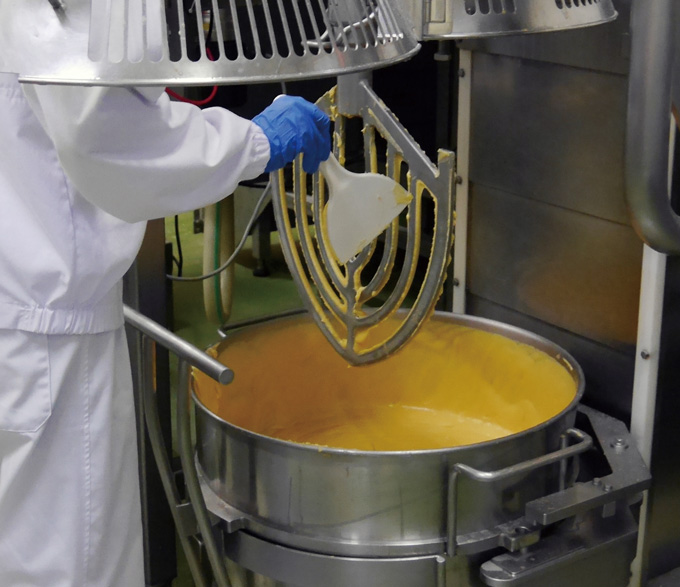 機械で小麦粉とたまごを混ぜる。たまごは日によって濃さが違うため、混ぜる時間も変わる。職人の技。 -