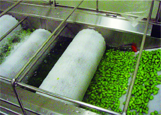 がんもに混ぜる枝豆は水洗浄後、目視で検品。金属探知機にかけて、さやの残りや異物確認を徹底チェック