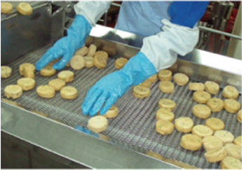 急速冷凍されたがんもは異物探知機でチェックし、焼き色や形など外観を目視で確認する
