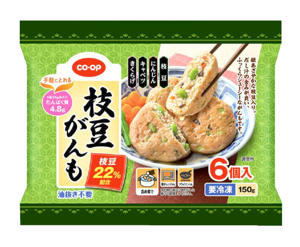 枝豆をがんもの中に入れてみると、鮮やかな緑が生地の中で映え、また歯ごたえのある食感が、がんものやわらかい生地の中で生きました。さらに、枝豆がんもと同じ大豆ということもあり、味の相性もよかったため、「枝豆」をメインの具材とした「CO・OP枝豆がんも」が誕生しました。
