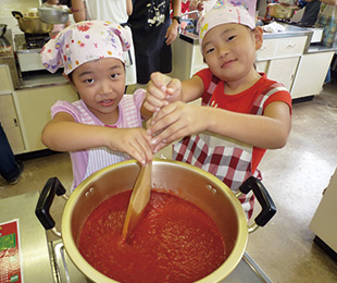 収穫体験後はケチャップ作り。トマトピューレに調味料や香辛料を加えて煮込む。 -