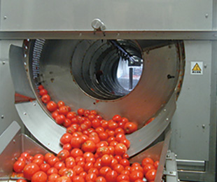 工場に運ばれたトマトは、水泡とシャワーの洗浄機できれいに水洗いされる。