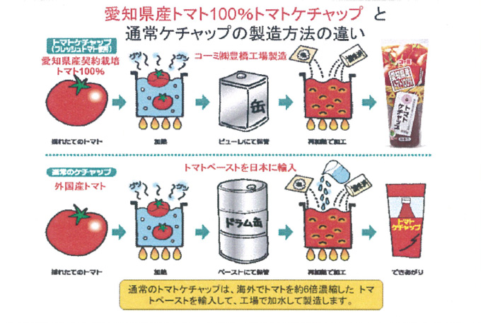 加工用トマトの生産者から、「自分たちが作ったトマトはどうなるの?」と聞かれたことがありました。それまでのケチャップは「国産」とうたい、愛知県産のトマトもこの中に含まれていました。愛知県は加工用トマトの栽培が盛んな土地です。「これではいけない」と2010年に「愛知県産トマト100%トマトケチャップ」を作りました。