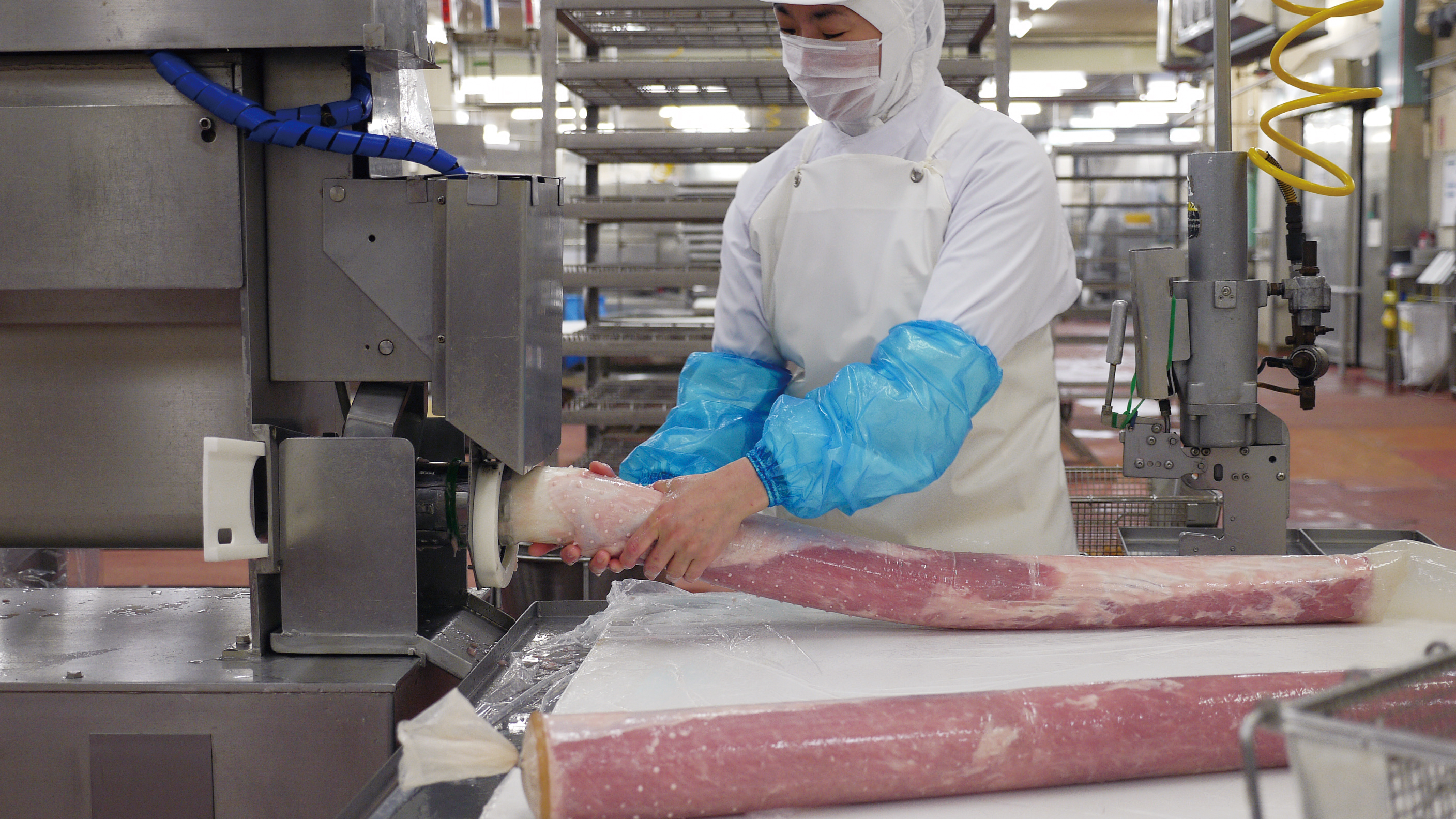 ケーシングという包装素材で包み、ハムの形に整える。その際、強く縛り過ぎないよう、こつのいる作業 -