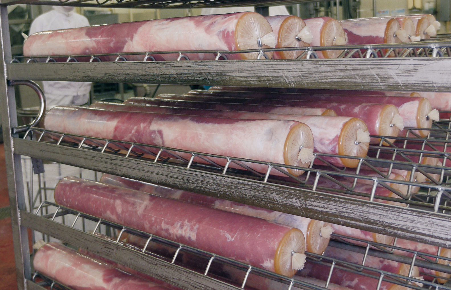 ケーシング詰めしたハム原木を乾燥・燻煙・加熱。冷却後、ケーシングを取り除きスライスする -