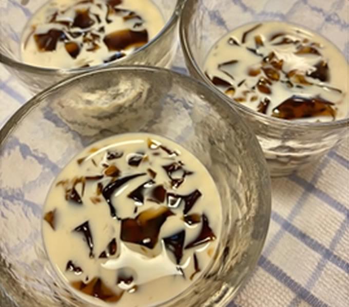 すっきりとした牛乳の味が、ほろ苦いコーヒーゼリーを引き立てます。食後のスイーツに! コーヒーゼリーでカフェオーレ