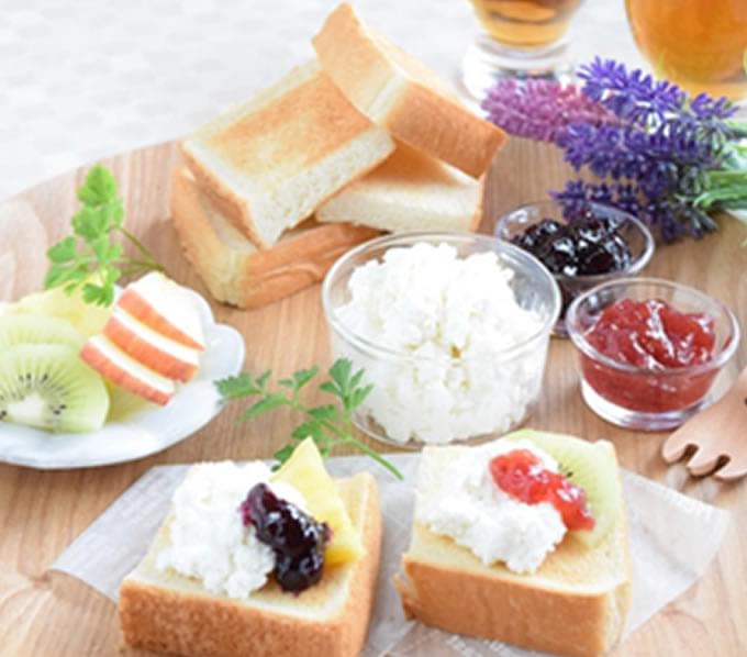 - 器に❹、❺、お好みのジャム、フルーツを盛りつけたら、食パンにチーズやジャム、フルーツをのせる。