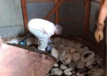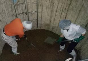 みそのもとを詰める作業。天井の高さほどある桶の中で、足とスコップを使って踏み込む。
