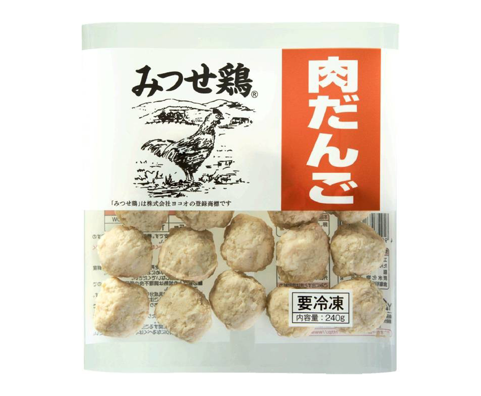 肉だんごは、1997年に、当時株式会社ヨコオ※が運営していた三瀬ルベール牧場・どんぐり村のレストランで提供していた、みつせ鶏ハンバーグから考案されました。一般の肉だんごより肉の割合が多く、ミンチのサイズも粗いため、口にしたときに肉々しさが感じられます。みつせ鶏のおいしさがそのまま伝わるように、だんごにした形状をゆでて固めているのが特徴です。調理したとき、つなぎのパン粉が調味料を吸いやすくなり、味しみもよくなるのです。