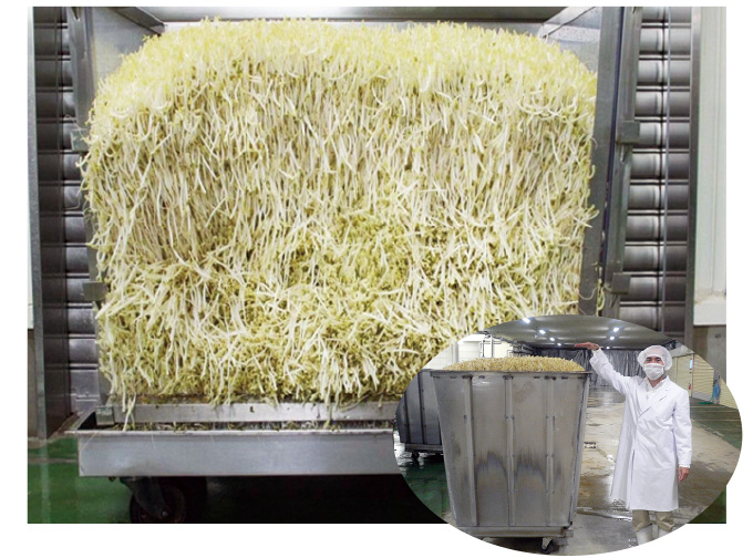 光の無い暗室で、栽培の室温、水温、室内の環境をコントロール。発芽してから7~10日でもやしになる
