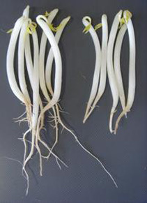 もちろん袋以外にも生協の緑豆もやしには特徴があります。生協の緑豆もやしは根が短くなっています。これは食感や歯触りがよくなるように根取り処理されているからで、根取り装置で根っこを60%以上カットしています。