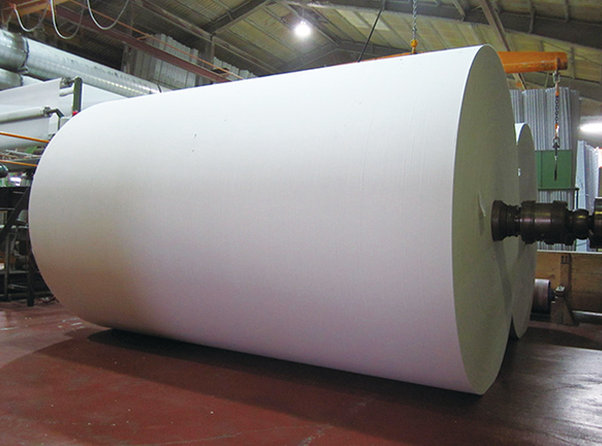 フィルムやインクを落とした古紙は、いろいろな工程ごとに洗浄を行い、抄紙機(しょうしき)で再び紙にし、いったん大きなロールにする。鉄の芯に巻きつけた紙の幅は約3m、重さは約2トン