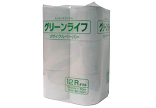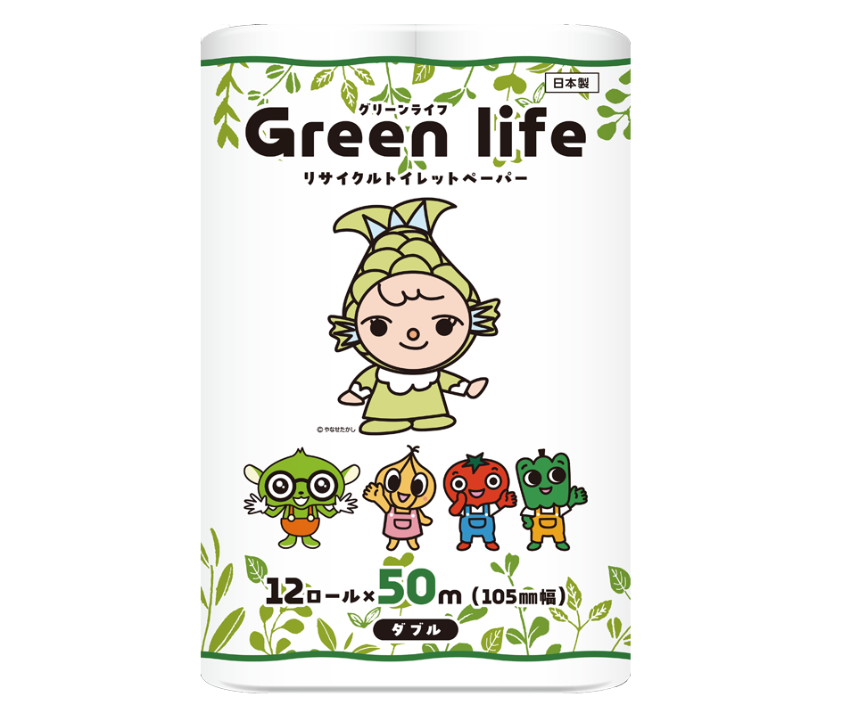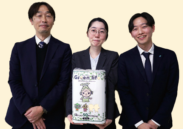 丸富製紙は、トイレットロールの生産量が家庭紙製造のメーカーの中でもトップクラスです。全国で初めて原料に牛乳パックを再利用したり、芯のないトイレットロールを開発したりと、製紙業界のパイオニア的企業です。丸富製紙は「故紙ロール」の背景にある組合員の思いを受け取り、製造を請け負いました。2006年「グリーンライフリサイクルペーパー」に名称を変更して発売。急な製造にパッケージのデザインが間に合わず、商品名だけが印刷されていました。現在は東海3生協※のキャラクターが印刷され、組合員が環境に配慮し、長さにこだわり、消費者として考えた、オリジナルの商品であることを伝えています。