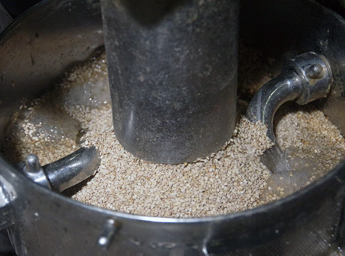ごまについた砂やほこりを洗い落とす。水洗い後は遠心力を利用して適度な水分量になるまで脱水する。