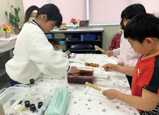 しょうゆのクイズやみたらし団子作りなど、親子で参加できる体験学習。 -