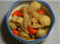 - 鍋にだし汁を沸騰させ、❶と丸大豆しょうゆを入れる。再度煮立てて、沸騰したら弱火で15分。