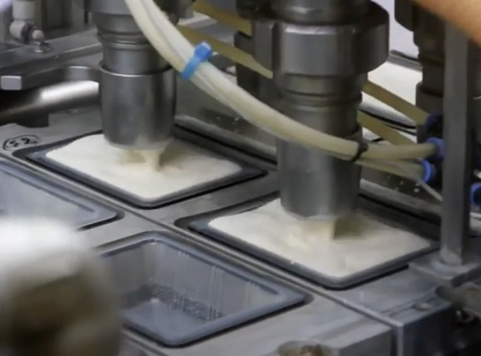 直接容器に豆乳と凝固剤を入れ、衛生的に製造している