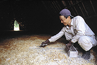 別府市の湯山地区は火山活動が活発で地熱が高く、温泉ガスが激しく噴出しています。このガスの上に小屋を建て、この地独特の青粘土にガスを通過させると、粘土の中のミネラルや温泉成分が化学変化して湯の花が生まれます。採取できるまで約2~3カ月。江戸時代から変わらず続くこの技法は、国の重要無形民俗文化財に指定されています。