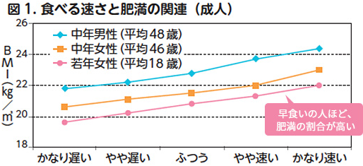 図1.食べる速さと肥満の関連(成人)/食べる速さが速ければ速いほど肥満の指標であるBMIの値が高くなっています。この理由として、食べるのが速い人は、食物繊維などの肥満を防ぐ栄養素の摂取量が少なく、よく噛まずに食べられるものを食べている可能性が挙げられます。