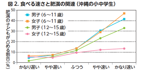 図2.食べる速さと肥満の関連(沖縄の小中学生)/小中学生でも食べるのが速い子どもほど、肥満の割合が多くなっています。ゆっくり食べようのメッセージは、特に子どもたちに伝えるべきものなのかもしれません。