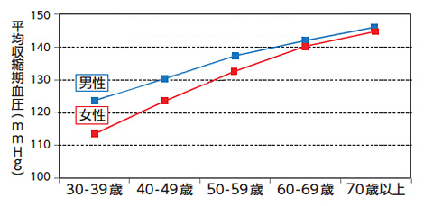 食塩の話を始める前に、年齢と血圧の関係を知っておきましょう。図1に、その関係を示しました(文献1)。男女とも年齢が上がると血圧が上昇していることが分かります。気を付けたいのは、30歳代、40歳代の若いうちからも、血圧は少しずつ上昇していることです。決して年をとってから急に上がるわけではないのです。