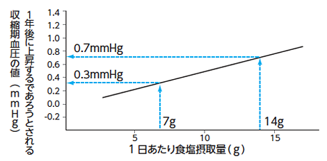 次に、食塩摂量と血圧の関係を知りましょう。先ほど説明したように、年とともに血圧は上昇していきますが、その上昇の度合いは食塩摂取量によって変わります。図2(文献2)からは、食塩摂取量が多いほど、1年後に上昇する血圧の値が大きくなっていることが分かります。もし食塩摂取量が1日あたりおよそ7gであれば、1年後に血圧は0.3mmHgくらい上がり、14gであれば血圧は0.7mmHgくらい上がることが読み取れます。