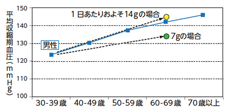 ここから30年後の血圧を予測してみましょう(図3)。図1の30歳代の男性が日本人男性の1日の食塩摂取量平均値である14g(文献3)の食塩摂取量を30年間続けると、60歳代になったときには黄の丸印まで上昇します。すでに高血圧の範囲に入っています。けれども、7gを30年間続けていれば、緑の丸印でとどまります。まだ正常の範囲内です。