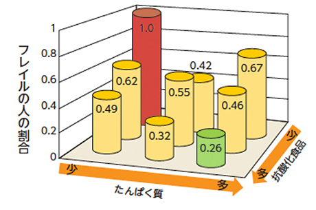図1.たんぱく質・抗酸化食品の組合せとフレイルの人の割合(文献4):たんぱく質と抗酸化食品の両方が最も少ない食事をしている赤色の群を1.0にしたときの各群のフレイルの人の割合を示しています。