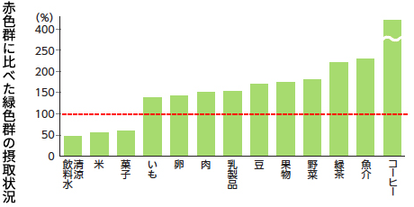 図2.たんぱく質・抗酸化食品の摂取量が両方とも多い人たちの食事の特徴(文献4):図1の赤色の群の摂取量を100%としたときの、緑色の群の人たちの摂取量を示しています。