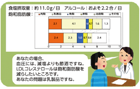 健康診断では、血圧や血中コレステロールの値をはかり、基準値よりも高いときには改善を促されます。けれども食事に関しては、食べているものをはからずに、「血圧を下げるためには減塩が大切です。ラーメンのスープは残しましょう。お漬物は食べないように。」などといった一般論で食事指導を受けることがあります。それよりも、図2のように食べているものを調べた(はかった)うえで「あなたの場合、血圧には減塩よりも節酒ですね。」などとポイントを説明してもらうほうが、効果的ですよね。